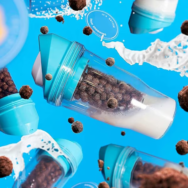 Two separate cups—one for cereal, one for milk—keep everything dry and crunchy until you’re ready to drink. No more sad, mushy breakfasts!