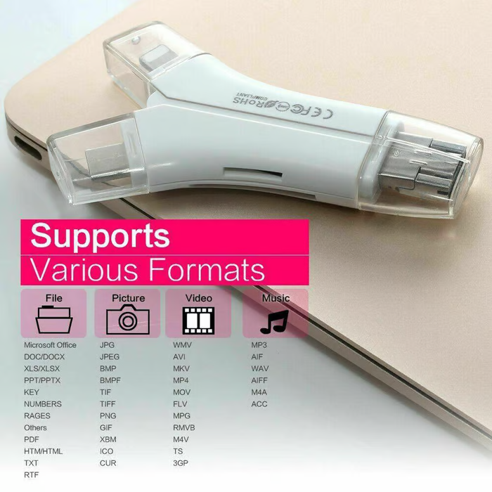 4 in 1 SD/TF Card Reader: This card reader fits all your devices with 4 interfaces: Adapter for iOS devices; USB C adapter for Type C devices; Micro USB adapter for Android devices; USB adapter for Computers/iMacs. A multifunctional gadget which can deal with your numerous devices perfectly.