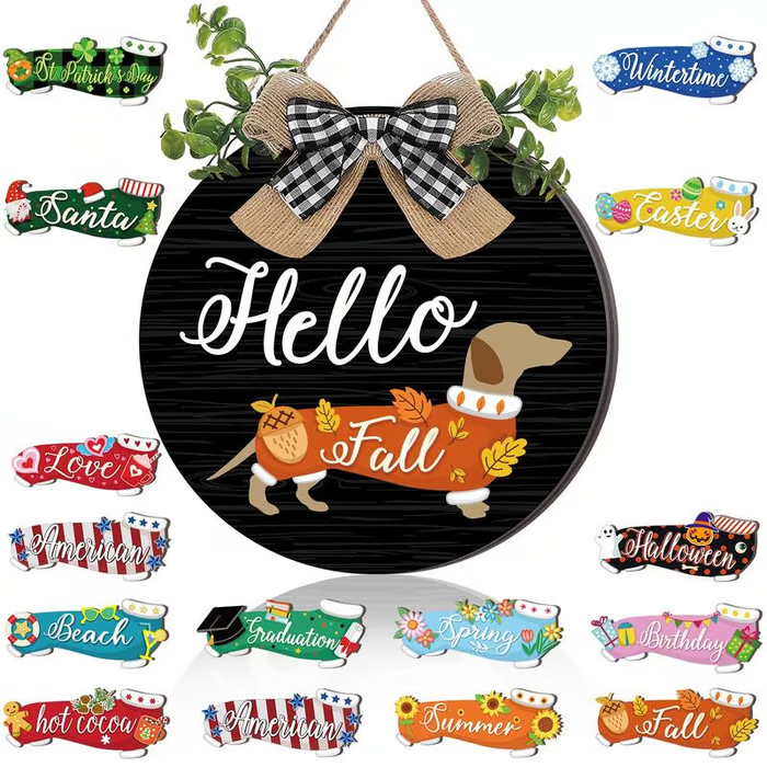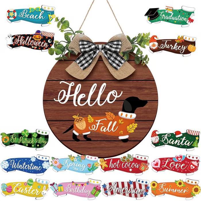This charming wooden sign features a delightful dachshund design and comes with a variety of detachable accessories, making it perfect for every season and occasion.  Whether it's Halloween, a birthday party, or just a cozy day at home, this sign adds a warm touch to your decor.